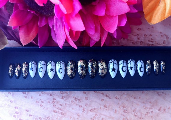 Stars Moons Gold Flake Dark Fall Autumn Custom Press On Etsy